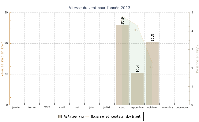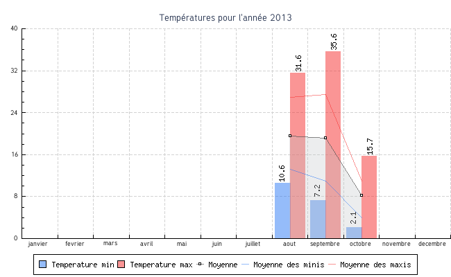 | octobre | 2.1 °C | 4.0 °C | 15.7 °C | 10.9 °C | 8.1 °C | 2.2 km/h | 20.5 km/h | SSO |