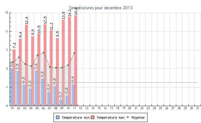 | 11 | -0.4 °C | 14.4 °C | 6.5 °C | 3.2 km/h (21.2 km/h) | NE |