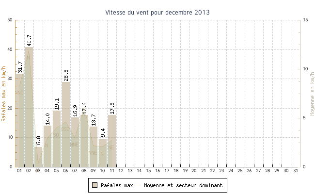 | min | max | moy | Vitesse (rafales) | Secteur | ||